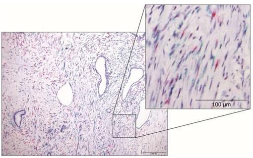 原位杂交数据显示人胰腺癌中Meflin阳性成纤维细胞(品红色)和-阴性成纤维细胞(绿色)的浸润。来源:水谷靖行名古... -