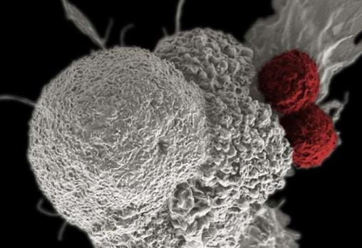 伪彩色扫描电子显微照片显示两个T细胞(红色)攻击癌细胞(白色)。研究人员正在通过编辑T细胞内的基因来创造更强... -