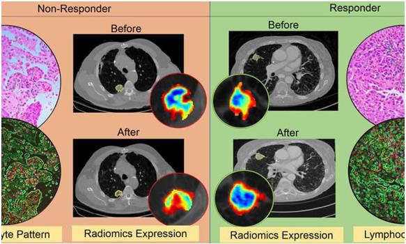 图片来源:凯斯西储大学免疫检查点抑制剂治疗前后的CT放射线模式差异的说明,同样发现在诊断活检中,在无反应... -