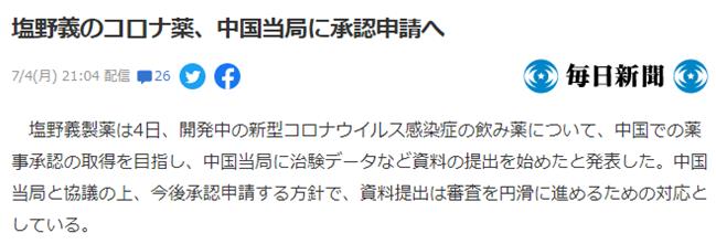 根据日本新闻报道,日本盐野义制药公司近日发布消息称,关于正在研发的新冠病毒治疗药,已经向中国监管机构提... -